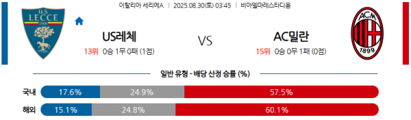 8월 30일 세리에A 레체 vs AC 밀란 경기 분석 및 예측