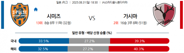 08월31일 18:30 J리그1 시미즈 vs 가시마 경기 분석