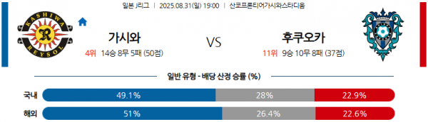 08월31일 19:00 J리그1 가시와 레이솔 vs 후쿠오카 경기 분석