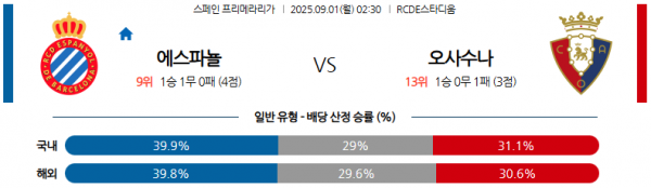 09월01일 02:30 라리가 에스파뇰 vs 오사수나 경기 분석
