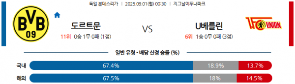 09월01일 00:30 분데스리가 도르트문트 vs 우니온 베를린 경기 분석