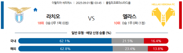 09월01일 03:45 세리에 라치오 vs 베로나 경기 분석