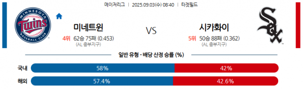 09월03일 08:40 MLB 미네소타 트윈스 vs 시카고 화이트삭스