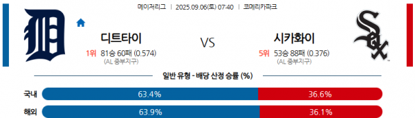 09월06일 07:40 MLB 디트로이트 타이거스 vs 시카고 화이트삭스 경기 분석