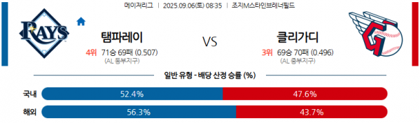 09월06일 08:35 MLB 템파베이 레이스 vs 클리블랜드 가디언스 경기 분석