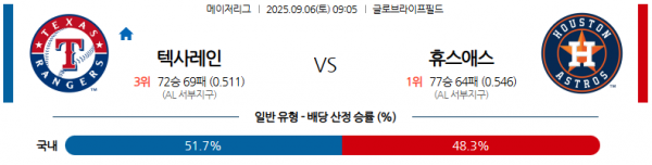 09월06일 09:05 MLB 텍사스 레인저스 vs 휴스턴 애스트로스 경기 분석