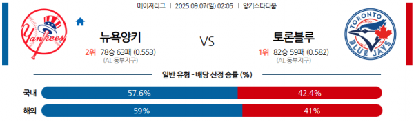 09월07일 02:05 MLB 뉴욕 양키스 vs 토론토 블루제이스 경기 분석