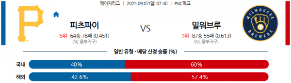 09월07일 07:40 MLB 피츠버그 파이어리츠 vs 밀워키 브루어스 경기 분석