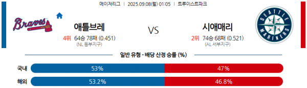 09월 08일 01:05 MLB 애틀랜타 브레이브스 vs 시애틀 매리너스 경기 분석