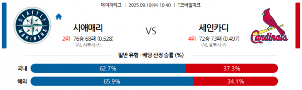 09월 10일 10:40 MLB 시애틀 매리너스 vs 세인트루이스 카디널스 경기 분석