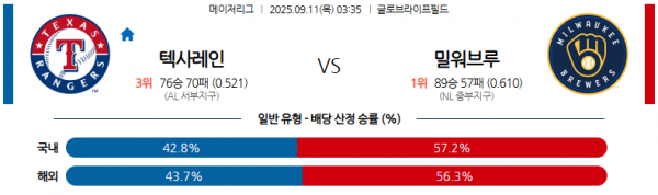 09월 11일 03:35 MLB 텍사스 레인저스 vs 밀워키 브루어스 경기 분석