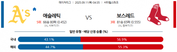 09월 11일 04:35 MLB 애슬레틱스 vs 보스턴 레드삭스 경기 분석