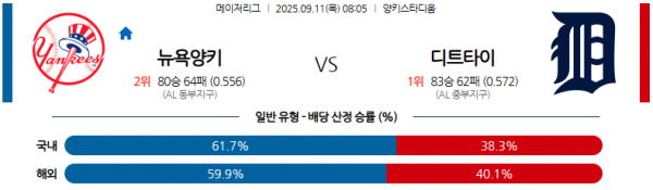 09월 11일 08:05 MLB 뉴욕 양키즈 vs 디트로이트 타이거스 경기 분석