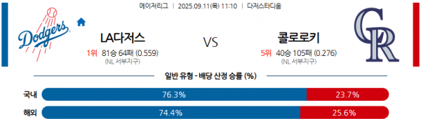 09월 11일 11:10 MLB LA다저스 vs 콜로라도 로키스 경기 분석