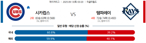09월 13일 03:20 MLB 시카고 컵스 vs 탬파베이 레이스 경기 분석