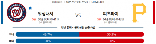 09월 13일 07:45 MLB 워싱턴 내셔널스 vs 피츠버그 파이어리츠 경기 분석