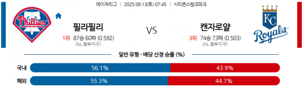 09월 13일 07:45 MLB 필라델피아 필리스 vs 캔자스시티 로얄스 경기 분석