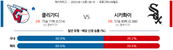 09월 13일 08:10 MLB 클리블랜드 가디언스 vs 시카고 화이트삭스 경기 분석
