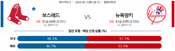 09월 13일 08:10 MLB 보스턴 레드삭스 vs 뉴욕 양키스 경기 분석