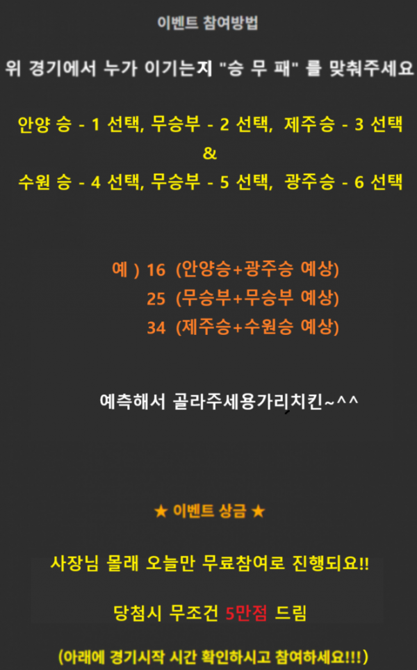 ★한번더 무료참여 머니이벤트★ 09월 14일 19:00 K리그1 두경기 승무패를 맞춰주세요!!! 작성자 정보 봉고소장쪽지보내기 메일보내기 자기소개 아이디로 검색 전체게시물쪽지보내기 메일보내기 자기소개 아이디로 검색 전체게시물 작성 작성일 2025.09.13 23:35 컨텐츠 정보 이벤트 참가자 : 36 댓글 조회수 : 309 조회 목록 본문 회원 가입 후 참여해주세영~ 이벤트 참여할 수 있는 권한이 없습니다. 이벤트 참여자 36 명 봉고소장님의 댓글 미당첨 봉고소장쪽지보내기 메일보내기 자기소개 아이디로 검색 전체게시물쪽지보내기 메일보내기 자기소개 아이디로 검색 전체게시물 작성일 2025.09.13 23:40 26 26 아몰랑님의 댓글 미당첨 아몰랑쪽지보내기 메일보내기 자기소개 아이디로 검색 전체게시물쪽지보내기 메일보내기 자기소개 아이디로 검색 전체게시물 작성일 2025.09.13 23:59 24 24 dannycap님의 댓글 미당첨 dannycap쪽지보내기 메일보내기 자기소개 아이디로 검색 전체게시물쪽지보내기 메일보내기 자기소개 아이디로 검색 전체게시물 작성일 2025.09.14 00:07 26 26 카투만두님의 댓글 미당첨 카투만두쪽지보내기 메일보내기 자기소개 아이디로 검색 전체게시물쪽지보내기 메일보내기 자기소개 아이디로 검색 전체게시물 작성일 2025.09.14 00:11 34 34 oscar님의 댓글 미당첨 oscar쪽지보내기 메일보내기 자기소개 아이디로 검색 전체게시물쪽지보내기 메일보내기 자기소개 아이디로 검색 전체게시물 작성일 2025.09.14 00:14 24 24 붐바위님의 댓글 미당첨 붐바위쪽지보내기 메일보내기 자기소개 아이디로 검색 전체게시물쪽지보내기 메일보내기 자기소개 아이디로 검색 전체게시물 작성일 2025.09.14 00:15 34 34 길버님의 댓글 미당첨 길버쪽지보내기 메일보내기 자기소개 아이디로 검색 전체게시물쪽지보내기 메일보내기 자기소개 아이디로 검색 전체게시물 작성일 2025.09.14 00:21 14 14 tsla님의 댓글 미당첨 tsla쪽지보내기 메일보내기 자기소개 아이디로 검색 전체게시물쪽지보내기 메일보내기 자기소개 아이디로 검색 전체게시물 작성일 2025.09.14 00:27 14 14 롱다리님의 댓글 당첨 롱다리쪽지보내기 메일보내기 자기소개 아이디로 검색 전체게시물쪽지보내기 메일보내기 자기소개 아이디로 검색 전체게시물 작성일 2025.09.14 00:34 16 16 컨시드님의 댓글 미당첨 컨시드쪽지보내기 메일보내기 자기소개 아이디로 검색 전체게시물쪽지보내기 메일보내기 자기소개 아이디로 검색 전체게시물 작성일 2025.09.14 00:39 14 14 엔드게임님의 댓글 미당첨 엔드게임쪽지보내기 메일보내기 자기소개 아이디로 검색 전체게시물쪽지보내기 메일보내기 자기소개 아이디로 검색 전체게시물 작성일 2025.09.14 00:48 14 14 도시남자님의 댓글 미당첨 도시남자쪽지보내기 메일보내기 자기소개 아이디로 검색 전체게시물쪽지보내기 메일보내기 자기소개 아이디로 검색 전체게시물 작성일 2025.09.14 00:59 14 14 지웅이님의 댓글 당첨 지웅이쪽지보내기 메일보내기 자기소개 아이디로 검색 전체게시물쪽지보내기 메일보내기 자기소개 아이디로 검색 전체게시물 작성일 2025.09.14 01:06 16 16 새싹그얌님의 댓글 당첨 새싹그얌쪽지보내기 메일보내기 자기소개 아이디로 검색 전체게시물쪽지보내기 메일보내기 자기소개 아이디로 검색 전체게시물 작성일 2025.09.14 01:09 16 16 마레뿌드레님의 댓글 미당첨 마레뿌드레쪽지보내기 메일보내기 자기소개 아이디로 검색 전체게시물쪽지보내기 메일보내기 자기소개 아이디로 검색 전체게시물 작성일 2025.09.14 02:13 34 34 짭스님의 댓글 당첨 짭스쪽지보내기 메일보내기 자기소개 아이디로 검색 전체게시물쪽지보내기 메일보내기 자기소개 아이디로 검색 전체게시물 작성일 2025.09.14 02:51 16 16 황금악마님의 댓글 당첨 황금악마쪽지보내기 메일보내기 자기소개 아이디로 검색 전체게시물쪽지보내기 메일보내기 자기소개 아이디로 검색 전체게시물 작성일 2025.09.14 04:04 16 16 람이님의 댓글 미당첨 람이쪽지보내기 메일보내기 자기소개 아이디로 검색 전체게시물쪽지보내기 메일보내기 자기소개 아이디로 검색 전체게시물 작성일 2025.09.14 05:15 14 14 발야구님의 댓글 미당첨 발야구쪽지보내기 메일보내기 자기소개 아이디로 검색 전체게시물쪽지보내기 메일보내기 자기소개 아이디로 검색 전체게시물 작성일 2025.09.14 05:20 14 14 물개님의 댓글 당첨 물개쪽지보내기 메일보내기 자기소개 아이디로 검색 전체게시물쪽지보내기 메일보내기 자기소개 아이디로 검색 전체게시물 작성일 2025.09.14 05:32 16 16 보스톤님의 댓글 미당첨 보스톤쪽지보내기 메일보내기 자기소개 아이디로 검색 전체게시물쪽지보내기 메일보내기 자기소개 아이디로 검색 전체게시물 작성일 2025.09.14 06:45 14 14 한번만먹자님의 댓글 미당첨 한번만먹자쪽지보내기 메일보내기 자기소개 아이디로 검색 전체게시물쪽지보내기 메일보내기 자기소개 아이디로 검색 전체게시물 작성일 2025.09.14 08:40 26 26 데굴데굴님의 댓글 당첨 데굴데굴쪽지보내기 메일보내기 자기소개 아이디로 검색 전체게시물쪽지보내기 메일보내기 자기소개 아이디로 검색 전체게시물 작성일 2025.09.14 10:41 16 16 한스님의 댓글 당첨 