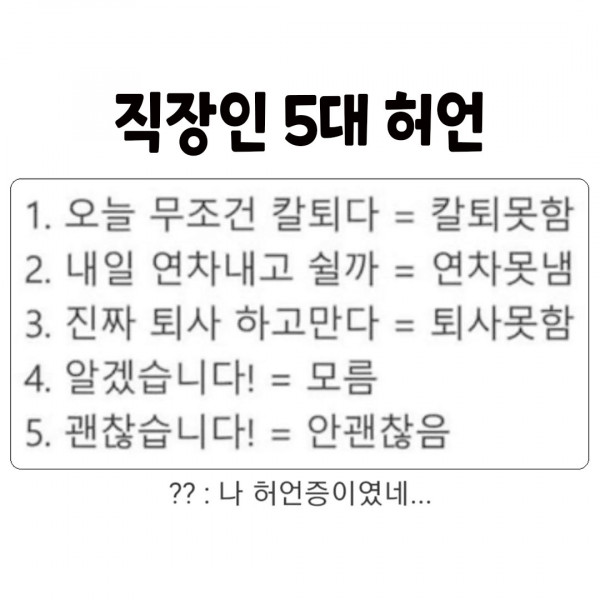 직장인 5대허언 작성자 정보 짭스쪽지보내기 메일보내기 자기소개 아이디로 검색 전체게시물쪽지보내기 메일보내기 자기소개 아이디로 검색 전체게시물 작성 작성일 2025.04.29 01:21 컨텐츠 정보 424 조회 2 댓글 목록 관리 글검색 본문 젠장ㅜㅜ 주의:포인트획득을 위한 게시글작성시 차단처리됩니다. SNS 공유 신고 관련자료 댓글 2 호돌이님의 댓글 호돌이쪽지보내기 메일보내기 자기소개 아이디로 검색 전체게시물쪽지보내기 메일보내기 자기소개 아이디로 검색 전체게시물 작성일 2025.04.29 06:03 알면서도 모르는척해야하는 샐러리맨의 일상인듯... 신고 알면서도 모르는척해야하는 샐러리맨의 일상인듯... 발야구님의 댓글 발야구쪽지보내기 메일보내기 자기소개 아이디로 검색 전체게시물쪽지보내기 메일보내기 자기소개 아이디로 검색 전체게시물 작성일 2025.04.29 07:08 ㅋㅋㅋ 재미 있네요~~ 신고 ㅋㅋㅋ 재미 있네요~~ 로그인한 회원만 댓글 등록이 가능합니다. 목록 관리 글검색