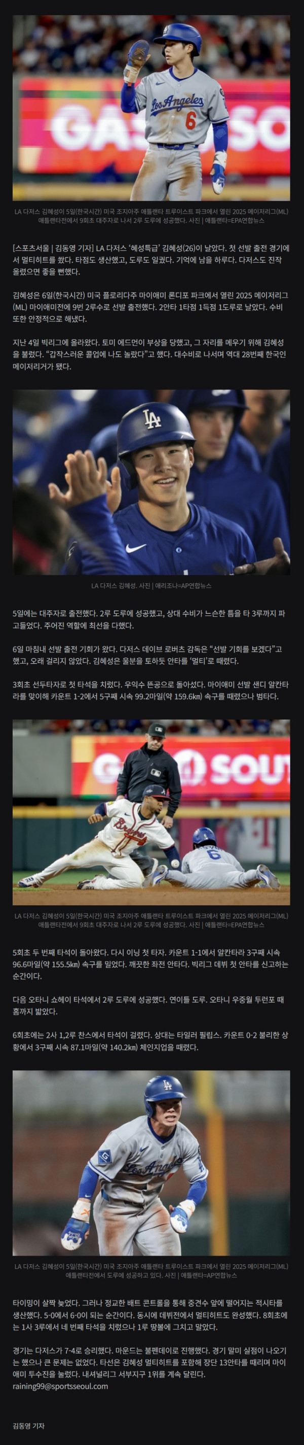 ‘멀티히트+타점+득점+도루’ 김혜성, 선발 데뷔전 ‘미쳤다’…LAD도 7-4 승리 NL 서부 1위 질주 작성자 정보 문스타쪽지보내기 메일보내기 자기소개 아이디로 검색 전체게시물쪽지보내기 메일보내기 자기소개 아이디로 검색 전체게시물 작성 작성일 2025.05.06 12:08 컨텐츠 정보 898 조회 3 댓글 목록 본문 주의:포인트획득을 위한 게시글작성시 차단처리됩니다. SNS 공유 신고 문스타쪽지보내기 메일보내기 자기소개 아이디로 검색 전체게시물쪽지보내기 메일보내기 자기소개 아이디로 검색 전체게시물 레벨 96 100% 등록일 12.15 고객 눈앞에서 1500만원 슈킹한 직원 수준 댓글 3 등록일 12.15 성심당 말차열풍 합류 말차시루 11일부터 판매예정 댓글 3 등록일 12.15 두더지 가장의 삶... 댓글 3 등록일 12.14 사건반장) 박나래 매니저가 화난 부분들 댓글 2 관련자료 댓글 3 짭스님의 댓글 짭스쪽지보내기 메일보내기 자기소개 아이디로 검색 전체게시물쪽지보내기 메일보내기 자기소개 아이디로 검색 전체게시물 작성일 2025.05.06 13:06 2루도훔치고 3루도훔치고 흥해라! 신고 2루도훔치고 3루도훔치고 흥해라! 삼팬님의 댓글 삼팬쪽지보내기 메일보내기 자기소개 아이디로 검색 전체게시물쪽지보내기 메일보내기 자기소개 아이디로 검색 전체게시물 작성일 2025.05.06 13:50 오타니는 언제봐도 레전드다 신고 오타니는 언제봐도 레전드다 미운오리님의 댓글 미운오리쪽지보내기 메일보내기 자기소개 아이디로 검색 전체게시물쪽지보내기 메일보내기 자기소개 아이디로 검색 전체게시물 작성일 2025.05.07 07:27 키움이 선수는 잘 키우네요 신고 키움이 선수는 잘 키우네요 로그인한 회원만 댓글 등록이 가능합니다. 목록