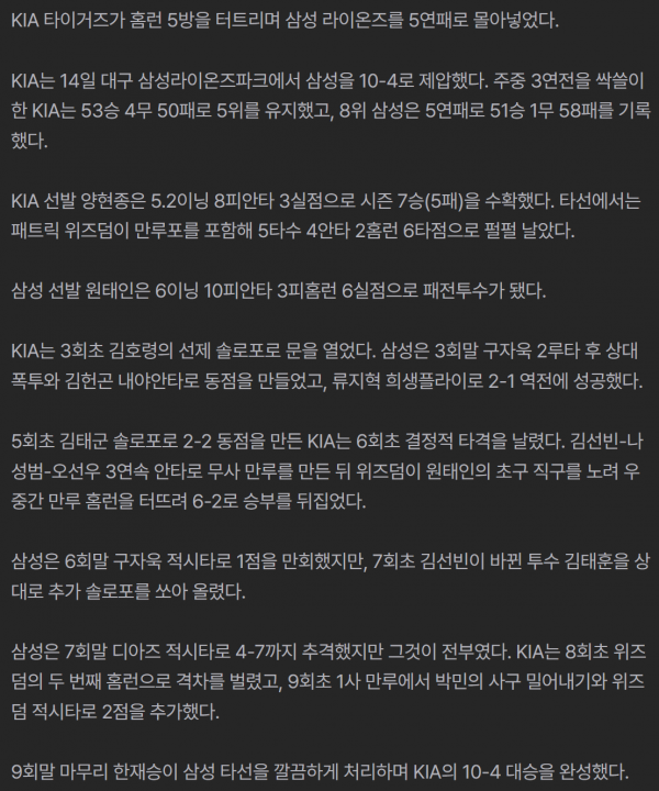 'KIA 홈런 5방 포격' 삼성 5연패 늪