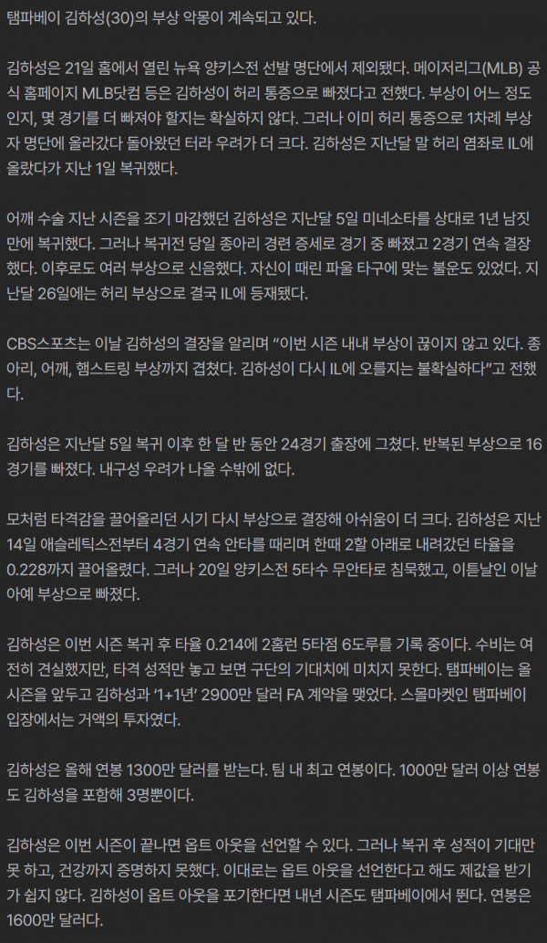 어쩌다 종아리부터 어깨까지 ‘유리몸’ 김하성…‘옵트 아웃’ 포기해도 내년 연봉은 1600만 달러