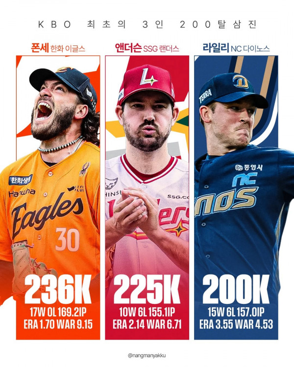 짭스님의 댓글 짭스쪽지보내기 메일보내기 자기소개 아이디로 검색 전체게시물쪽지보내기 메일보내기 자기소개 아이디로 검색 전체게시물 작성일 2025.09.15 08:34 종전 최고 기록은 2명 1986년 해태 선동열(214K), 롯데 최동원(208) 1996년 롯데 주형광(221K), 한화 정민철(203K 신고 종전 최고 기록은 2명 1986년 해태 선동열(214K), 롯데 최동원(208) 1996년 롯데 주형광(221K), 한화 정민철(203K