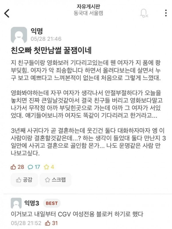 서로 길 막고 결혼한 케이스 작성자 정보 데굴데굴쪽지보내기 메일보내기 자기소개 아이디로 검색 전체게시물쪽지보내기 메일보내기 자기소개 아이디로 검색 전체게시물 작성 작성일 2025.09.16 21:04 컨텐츠 정보 160 조회 1 댓글 목록 본문 [펌] SNS 공유 신고 데굴데굴쪽지보내기 메일보내기 자기소개 아이디로 검색 전체게시물쪽지보내기 메일보내기 자기소개 아이디로 검색 전체게시물 레벨 16 91% 등록일 2025.09.20 신입사원이 따라준 맥주 댓글 4 등록일 2025.09.20 당근에 나타난 연금술사 댓글 4 등록일 2025.09.20 숨겨둔 비상금이 늘어나서 놀란... 댓글 4 등록일 2025.09.17 국제결혼 첫날밤 레전드 댓글 7 관련자료 댓글 1 데굴데굴님의 댓글 데굴데굴쪽지보내기 메일보내기 자기소개 아이디로 검색 전체게시물쪽지보내기 메일보내기 자기소개 아이디로 검색 전체게시물 작성일 2025.09.16 21:04 히히히~ 못가~~^^ㅋㅋㅋ 신고 히히히~ 못가~~^^ㅋㅋㅋ 로그인한 회원만 댓글 등록이 가능합니다. 목록