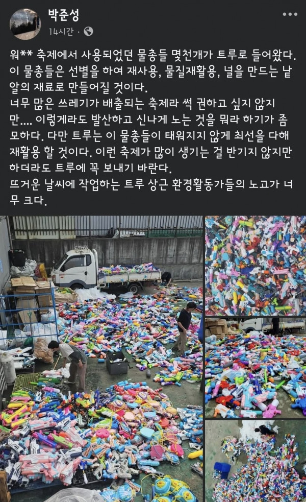 워터밤 이후 버려지는 물총들 규모 작성자 정보 데굴데굴쪽지보내기 메일보내기 자기소개 아이디로 검색 전체게시물쪽지보내기 메일보내기 자기소개 아이디로 검색 전체게시물 작성 작성일 2025.09.16 21:15 컨텐츠 정보 149 조회 9 댓글 목록 본문 [펌] SNS 공유 신고 데굴데굴쪽지보내기 메일보내기 자기소개 아이디로 검색 전체게시물쪽지보내기 메일보내기 자기소개 아이디로 검색 전체게시물 레벨 15 99% 등록일 2025.09.20 신입사원이 따라준 맥주 댓글 4 등록일 2025.09.20 당근에 나타난 연금술사 댓글 4 등록일 2025.09.20 숨겨둔 비상금이 늘어나서 놀란... 댓글 4 등록일 2025.09.17 국제결혼 첫날밤 레전드 댓글 7 관련자료 댓글 9 데굴데굴님의 댓글 데굴데굴쪽지보내기 메일보내기 자기소개 아이디로 검색 전체게시물쪽지보내기 메일보내기 자기소개 아이디로 검색 전체게시물 작성일 2025.09.16 21:17 워터밤은 안가봐서 모르겠지만... 그냥 버려지는 물이 아깝다고만 생각 했었는데 저렇게 버려지는 물총을 보니 워터밤 행사 같은건 안하는게 답인것 같네요^^;;;; 신고 워터밤은 안가봐서 모르겠지만... 그냥 버려지는 물이 아깝다고만 생각 했었는데 저렇게 버려지는 물총을 보니 워터밤 행사 같은건 안하는게 답인것 같네요^^;;;; suraksan님의 댓글 suraksan쪽지보내기 메일보내기 자기소개 아이디로 검색 전체게시물쪽지보내기 메일보내기 자기소개 아이디로 검색 전체게시물 작성일 2025.09.16 22:37 물총 장사들 돈버네 신고 물총 장사들 돈버네 데굴데굴님의 댓글의 댓글 데굴데굴쪽지보내기 메일보내기 자기소개 아이디로 검색 전체게시물쪽지보내기 메일보내기 자기소개 아이디로 검색 전체게시물 작성일 2025.09.17 23:32 워터밤 같은 행사를 할때에 매출이 확 올라갈것 같네요^^;; 신고 워터밤 같은 행사를 할때에 매출이 확 올라갈것 같네요^^;; 크린벨님의 댓글 크린벨쪽지보내기 메일보내기 자기소개 아이디로 검색 전체게시물쪽지보내기 메일보내기 자기소개 아이디로 검색 전체게시물 작성일 2025.09.17 00:09 저게 전부 1회용이라니..표 값에 포함되어 있으니 표 값이 비쌀 수 밖에 신고 저게 전부 1회용이라니..표 값에 포함되어 있으니 표 값이 비쌀 수 밖에 데굴데굴님의 댓글의 댓글 데굴데굴쪽지보내기 메일보내기 자기소개 아이디로 검색 전체게시물쪽지보내기 메일보내기 자기소개 아이디로 검색 전체게시물 작성일 2025.09.17 23:33 한번 사용하고 버려진다니 너무 아깝네요 저것도 자원 낭비일텐데 말이죠... 신고 한번 사용하고 버려진다니 너무 아깝네요 저것도 자원 낭비일텐데 말이죠... 깔끔한랩퍼♪™님의 댓글 깔끔한랩퍼♪™쪽지보내기 메일보내기 자기소개 아이디로 검색 전체게시물쪽지보내기 메일보내기 자기소개 아이디로 검색 전체게시물 작성일 2025.09.17 00:10 저게 뭐냐.... 지구가 이러니 죽어가지.. 신고 저게 뭐냐.... 지구가 이러니 죽어가지.. 데굴데굴님의 댓글의 댓글 데굴데굴쪽지보내기 메일보내기 자기소개 아이디로 검색 전체게시물쪽지보내기 메일보내기 자기소개 아이디로 검색 전체게시물 작성일 2025.09.17 23:35 저렇게 많은 양을 잠깐 사용하고 버려진다는게 너무 낭비가 심해 보여 보기에도 안좋고 환경에도 너무 안좋기는 한 것 같아요 신고 저렇게 많은 양을 잠깐 사용하고 버려진다는게 너무 낭비가 심해 보여 보기에도 안좋고 환경에도 너무 안좋기는 한 것 같아요 여시사랑님의 댓글 여시사랑쪽지보내기 메일보내기 자기소개 아이디로 검색 전체게시물쪽지보내기 메일보내기 자기소개 아이디로 검색 전체게시물 작성일 2025.09.17 05:13 다 플라스틱 일것인디~~!! 신고 다 플라스틱 일것인디~~!!{emo:onion-030.gif:50} 데굴데굴님의 댓글의 댓글 데굴데굴쪽지보내기 메일보내기 자기소개 아이디로 검색 전체게시물쪽지보내기 메일보내기 자기소개 아이디로 검색 전체게시물 작성일 2025.09.17 23:37 그러게요.. 저 부품들중에는 재활용도 안되는것들도 있을텐데 한번 사용후레 저렇게 버려진다는게 안타깝네요 신고 그러게요.. 저 부품들중에는 재활용도 안되는것들도 있을텐데 한번 사용후레 저렇게 버려진다는게 안타깝네요 로그인한 회원만 댓글 등록이 가능합니다. 목록