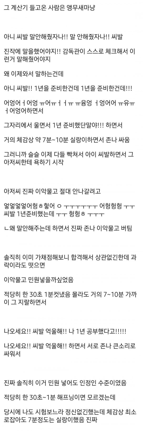 아몰랑님의 댓글 아몰랑쪽지보내기 메일보내기 자기소개 아이디로 검색 전체게시물쪽지보내기 메일보내기 자기소개 아이디로 검색 전체게시물 작성일 2025.09.17 13:22 1년간 힘들게 준비한건 안타깝지만 방송은 안했어도 육성으로 주의사항을 알려줬으면 그에따라 행동을 했어야지... 왜 열심히 준비하고 시험 보고 있는 다른 사람들을 방해하고 피해를 주는건지...에휴... 신고 1년간 힘들게 준비한건 안타깝지만 방송은 안했어도 육성으로 주의사항을 알려줬으면 그에따라 행동을 했어야지... 왜 열심히 준비하고 시험 보고 있는 다른 사람들을 방해하고 피해를 주는건지...에휴...{emo:onion-023.gif:50}