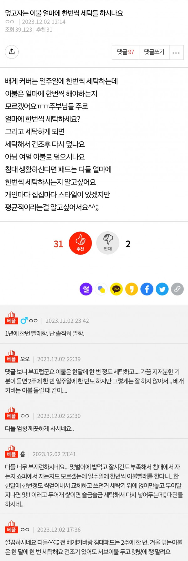 아몰랑님의 댓글 아몰랑쪽지보내기 메일보내기 자기소개 아이디로 검색 전체게시물쪽지보내기 메일보내기 자기소개 아이디로 검색 전체게시물 작성일 2025.09.18 12:32 이불 세탁을 잘 안하긴 하는데 한달에 한번은 세탁을 해야하나 보네요... 신고 이불 세탁을 잘 안하긴 하는데 한달에 한번은 세탁을 해야하나 보네요...{emo:onion-014.gif:50}