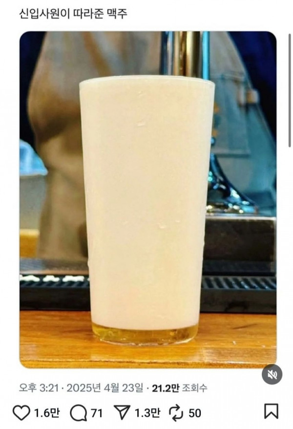 신입사원이 따라준 맥주 작성자 정보 데굴데굴쪽지보내기 메일보내기 자기소개 아이디로 검색 전체게시물쪽지보내기 메일보내기 자기소개 아이디로 검색 전체게시물 작성 작성일 2025.09.20 19:32 컨텐츠 정보 175 조회 4 댓글 목록 본문 [펌] SNS 공유 신고 데굴데굴쪽지보내기 메일보내기 자기소개 아이디로 검색 전체게시물쪽지보내기 메일보내기 자기소개 아이디로 검색 전체게시물 레벨 15 99% 등록일 2025.09.20 신입사원이 따라준 맥주 댓글 4 등록일 2025.09.20 당근에 나타난 연금술사 댓글 4 등록일 2025.09.20 숨겨둔 비상금이 늘어나서 놀란... 댓글 4 등록일 2025.09.17 국제결혼 첫날밤 레전드 댓글 7 관련자료 댓글 4 데굴데굴님의 댓글 데굴데굴쪽지보내기 메일보내기 자기소개 아이디로 검색 전체게시물쪽지보내기 메일보내기 자기소개 아이디로 검색 전체게시물 작성일 2025.09.20 19:34 맥주가 제대로 깔려있네...맥주를 따를때 거품이 나게 따라야 한다고는 하지만 저건 거품양이 쫌 심한 것 같은데...^^;; 신고 맥주가 제대로 깔려있네...맥주를 따를때 거품이 나게 따라야 한다고는 하지만 저건 거품양이 쫌 심한 것 같은데...^^;; 발야구님의 댓글 발야구쪽지보내기 메일보내기 자기소개 아이디로 검색 전체게시물쪽지보내기 메일보내기 자기소개 아이디로 검색 전체게시물 작성일 2025.09.20 20:46 거품만 드세요~~~ 신고 거품만 드세요~~~ 짭스님의 댓글 짭스쪽지보내기 메일보내기 자기소개 아이디로 검색 전체게시물쪽지보내기 메일보내기 자기소개 아이디로 검색 전체게시물 작성일 2025.09.20 20:50 어케하면 저리따를수 있나..? 신고 어케하면 저리따를수 있나..? 호돌이님의 댓글 호돌이쪽지보내기 메일보내기 자기소개 아이디로 검색 전체게시물쪽지보내기 메일보내기 자기소개 아이디로 검색 전체게시물 작성일 2025.09.22 00:05 완전히 거품이네요?? 신고 완전히 거품이네요?? 로그인한 회원만 댓글 등록이 가능합니다. 목록