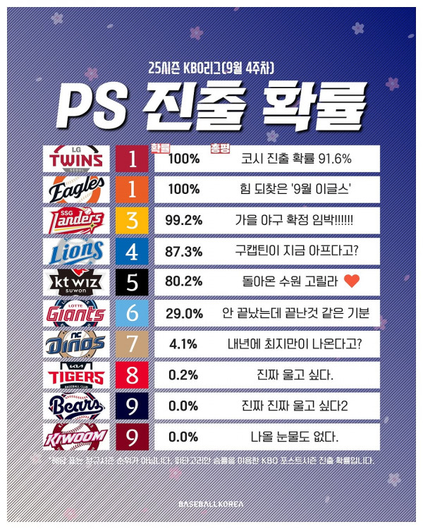 각 팀별 PS 진출확률..얼츄 맞나요? 작성자 정보 짭스쪽지보내기 메일보내기 자기소개 아이디로 검색 전체게시물쪽지보내기 메일보내기 자기소개 아이디로 검색 전체게시물 작성 작성일 2025.09.23 09:08 컨텐츠 정보 127 조회 3 댓글 목록 본문 9월22일기준 이라는데.. SNS 공유 신고 짭스쪽지보내기 메일보내기 자기소개 아이디로 검색 전체게시물쪽지보내기 메일보내기 자기소개 아이디로 검색 전체게시물 레벨 39 98% 등록일 01:02 곧 돌아옵니다! 댓글 1 등록일 00:43 희안한 오타니.. 댓글 1 등록일 00:38 20년전 원태인 댓글 3 등록일 00:29 이따가 잘자요~~ 관련자료 댓글 3 발야구님의 댓글 발야구쪽지보내기 메일보내기 자기소개 아이디로 검색 전체게시물쪽지보내기 메일보내기 자기소개 아이디로 검색 전체게시물 작성일 2025.09.23 10:00 네,, 공감 합니다~~ 신고 네,, 공감 합니다~~ 여시사랑님의 댓글 여시사랑쪽지보내기 메일보내기 자기소개 아이디로 검색 전체게시물쪽지보내기 메일보내기 자기소개 아이디로 검색 전체게시물 작성일 2025.09.23 14:53 진짜 울고 싶다~~!! 신고 진짜 울고 싶다~~!![https://365tving.com/data/editor/2509/cmt_2109719509_3vhIz2iK_488ec92af6711018f37c4bdc66189838e61a36cf.gif] 순돌이님의 댓글 순돌이쪽지보내기 메일보내기 자기소개 아이디로 검색 전체게시물쪽지보내기 메일보내기 자기소개 아이디로 검색 전체게시물 작성일 2025.09.23 21:45 얼추 그렇지않을까요 신고 얼추 그렇지않을까요 로그인한 회원만 댓글 등록이 가능합니다. 목록