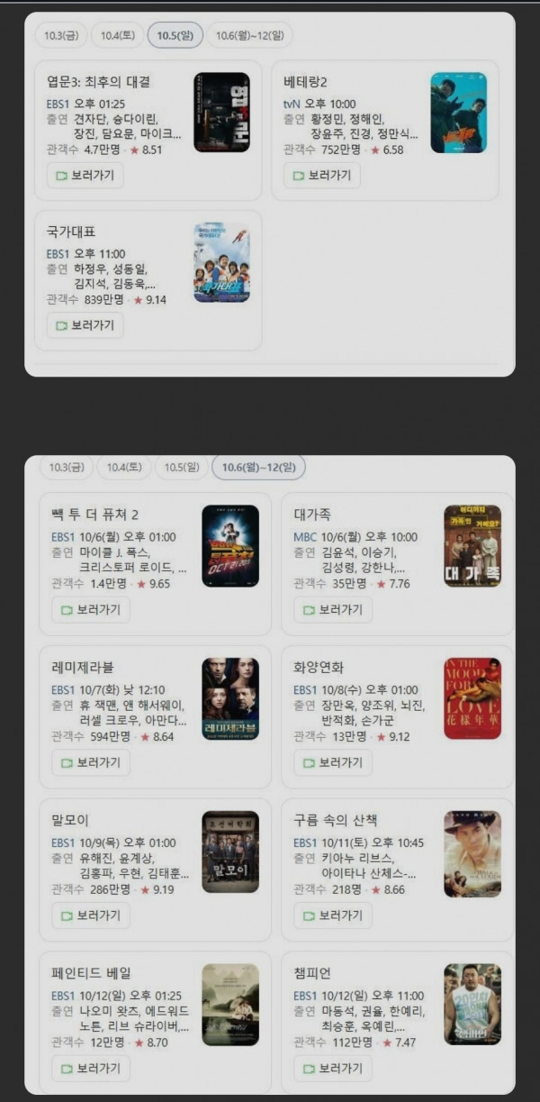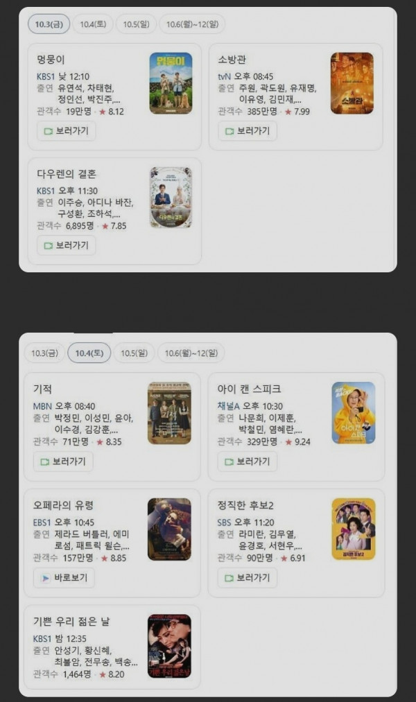 추석 특선 영화! 작성자 정보 짭스쪽지보내기 메일보내기 자기소개 아이디로 검색 전체게시물쪽지보내기 메일보내기 자기소개 아이디로 검색 전체게시물 작성 작성일 2025.10.01 19:35 컨텐츠 정보 173 조회 3 댓글 목록 본문 생각보다 별로지만 평온한 추석되시길! SNS 공유 신고 짭스쪽지보내기 메일보내기 자기소개 아이디로 검색 전체게시물쪽지보내기 메일보내기 자기소개 아이디로 검색 전체게시물 레벨 40 95% 등록일 10.15 대전 어느아파트! 한화 우승기원! 댓글 1 등록일 10.15 다시보는 엄지성, 오현규 골 댓글 1 등록일 10.15 다시보는 디아즈 이재현 백투백 댓글 2 등록일 10.14 곧 돌아옵니다! 댓글 3 관련자료 댓글 3 suraksan님의 댓글 suraksan쪽지보내기 메일보내기 자기소개 아이디로 검색 전체게시물쪽지보내기 메일보내기 자기소개 아이디로 검색 전체게시물 작성일 10.01 21:10 영화가 많이 달라졌네 신고 영화가 많이 달라졌네 짭스님의 댓글 짭스쪽지보내기 메일보내기 자기소개 아이디로 검색 전체게시물쪽지보내기 메일보내기 자기소개 아이디로 검색 전체게시물 작성일 10.02 18:52 바쁜시간 짬내어 소소한 행복이죠ㅎㅎ 신고 바쁜시간 짬내어 소소한 행복이죠ㅎㅎ 호돌이님의 댓글 호돌이쪽지보내기 메일보내기 자기소개 아이디로 검색 전체게시물쪽지보내기 메일보내기 자기소개 아이디로 검색 전체게시물 작성일 10.04 06:44 주로 옛날영화를 보여주는군요. 신고 주로 옛날영화를 보여주는군요. 로그인한 회원만 댓글 등록이 가능합니다. 목록