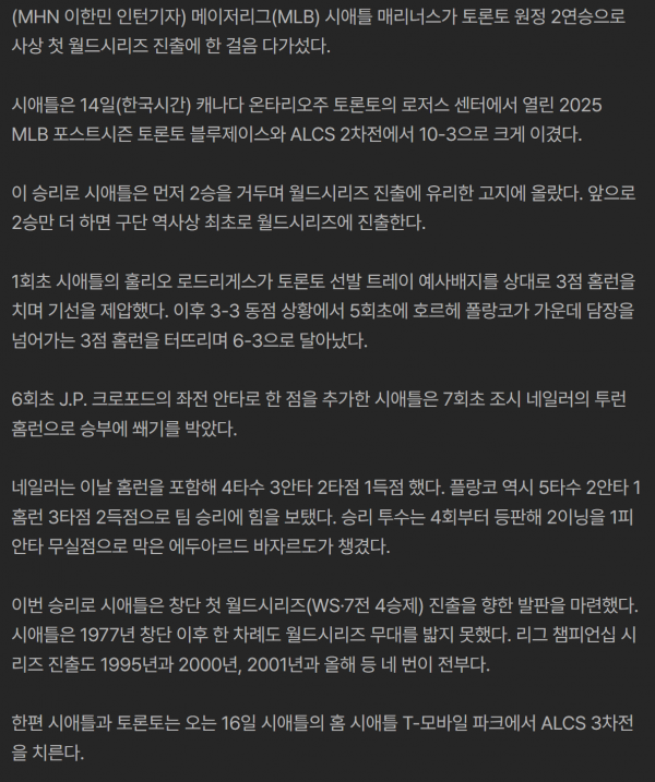 홈런 3방 폭발 시애틀 사상 첫 WS 성큼 작성자 정보 여시사랑쪽지보내기 메일보내기 자기소개 아이디로 검색 전체게시물쪽지보내기 메일보내기 자기소개 아이디로 검색 전체게시물 작성 작성일 2025.10.14 13:04 컨텐츠 정보 26 조회 1 댓글 목록 본문 토론토 원정 2연승 SNS 공유 신고 여시사랑쪽지보내기 메일보내기 자기소개 아이디로 검색 전체게시물쪽지보내기 메일보내기 자기소개 아이디로 검색 전체게시물 레벨 24 96% 등록일 13:04 홈런 3방 폭발 시애틀 사상 첫 WS 성큼 댓글 1 등록일 13:00 '스넬 8이닝 10K 무실점' 다저스 NLCS 기선제압 댓글 1 등록일 04:56 일본에서 ㅈ같다고 소문난 동네 댓글 2 등록일 10.13 캄보디아 공중 쓰레기통에서 나온것들 댓글 3 관련자료 댓글 1 여시사랑님의 댓글 여시사랑쪽지보내기 메일보내기 자기소개 아이디로 검색 전체게시물쪽지보내기 메일보내기 자기소개 아이디로 검색 전체게시물 작성일 13:04 신고 [https://365tvda.com/data/editor/2510/cmt_2109719509_IoMOnlGR_3ad1087afc959d4ec590fb5a9cdca20988537933.gif] 로그인한 회원만 댓글 등록이 가능합니다. 목록
