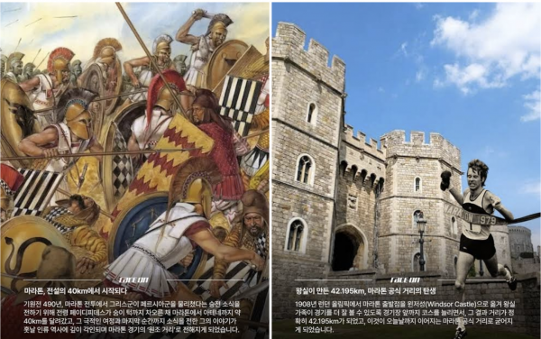 원래 대략 40km에 가까웠는데 영국 왕족들이 쉽게 보려고 원래 정해진 출발점에서 억지로 옮기고 런던 마라톤의 총 길이가 42.195km로 늘어남 그후부터 42.195km로 굳혀짐  세상에 뭔가 이상하다 싶은건 배후에 영국이 있음