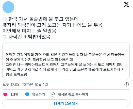 돌솥밥에 물 붓고 있는데 옆자리 외국인이 작성자 정보 012oppaㅡ문스타쪽지보내기 메일보내기 자기소개 아이디로 검색 전체게시물쪽지보내기 메일보내기 자기소개 아이디로 검색 전체게시물 작성 작성일 2025.11.06 10:17 컨텐츠 정보 23 조회 2 댓글 목록 본문 ㄴ. SNS 공유 신고 012oppaㅡ문스타쪽지보내기 메일보내기 자기소개 아이디로 검색 전체게시물쪽지보내기 메일보내기 자기소개 아이디로 검색 전체게시물 레벨 91 98% 등록일 10:17 돌솥밥에 물 붓고 있는데 옆자리 외국인이 댓글 2 등록일 10:17 쌈 싸 먹을 때 깻잎쌈이다 vs 상추쌈이다 댓글 2 등록일 10:16 이재용의 의외의 장점 댓글 2 등록일 11.04 나는 솔로 어제자 명장면 댓글 4 관련자료 댓글 2 012oppaㅡ문스타님의 댓글 012oppaㅡ문스타쪽지보내기 메일보내기 자기소개 아이디로 검색 전체게시물쪽지보내기 메일보내기 자기소개 아이디로 검색 전체게시물 작성일 10:17 신고 {emo:onion-065.gif:50} 여행자님의 댓글 여행자쪽지보내기 메일보내기 자기소개 아이디로 검색 전체게시물쪽지보내기 메일보내기 자기소개 아이디로 검색 전체게시물 작성일 11:51 푸하하........ 신고 푸하하........ 로그인한 회원만 댓글 등록이 가능합니다. 목록