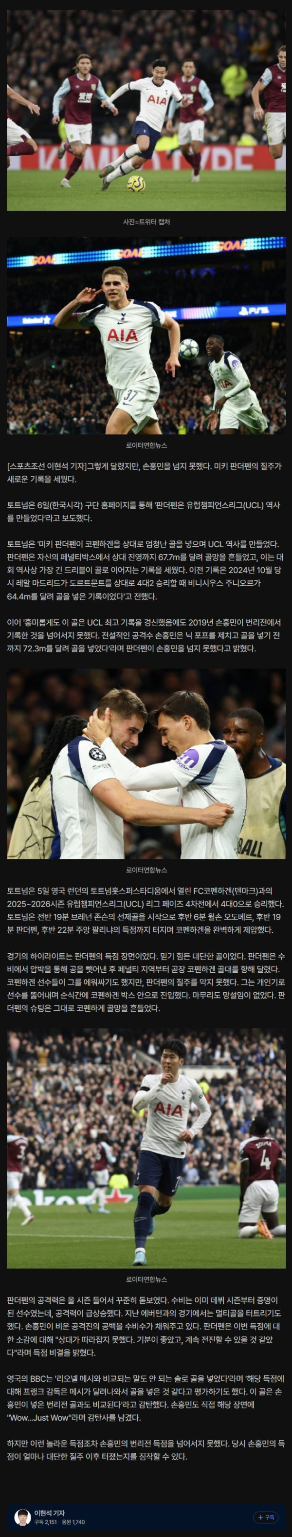 토트넘 '오피셜' 공식발표, '손흥민의 벽' 이렇게 높았나..."전설적인 공격수 SON의 '72.3m' 못 넘었다"→"UCL 역대 최고 기록만 달성" 작성자 정보 012oppaㅡ문스타쪽지보내기 메일보내기 자기소개 아이디로 검색 전체게시물쪽지보내기 메일보내기 자기소개 아이디로 검색 전체게시물 작성 작성일 2025.11.07 10:01 컨텐츠 정보 26 조회 4 댓글 목록 본문 s SNS 공유 신고 012oppaㅡ문스타쪽지보내기 메일보내기 자기소개 아이디로 검색 전체게시물쪽지보내기 메일보내기 자기소개 아이디로 검색 전체게시물 레벨 92 98% 등록일 10:03 대충격! 손흥민 사라지니 토트넘 홈구장 '텅텅'…UCL 관중 '4만명' 급추락→티켓값 끝내 내렸다 댓글 5 등록일 10:01 토트넘 '오피셜' 공식발표, '손흥민의 벽' 이렇게 높았나..."전설적인 공격수 SON의 '72.3m' 못 넘었다"→"UCL 역대 최고 기록만 달성" 댓글 4 등록일 10:00 황희찬 살았다! 텐 하흐 아닌 EPL ‘최고 미남’ 감독 부임 유력…英 단독 “공식 논의 시작” 댓글 5 등록일 11.06 돌솥밥에 물 붓고 있는데 옆자리 외국인이 댓글 4 관련자료 댓글 4 012oppaㅡ문스타님의 댓글 012oppaㅡ문스타쪽지보내기 메일보내기 자기소개 아이디로 검색 전체게시물쪽지보내기 메일보내기 자기소개 아이디로 검색 전체게시물 작성일 10:02 신고 {emo:onion-119.gif:50} 앙마365님의 댓글 앙마365쪽지보내기 메일보내기 자기소개 아이디로 검색 전체게시물쪽지보내기 메일보내기 자기소개 아이디로 검색 전체게시물 작성일 10:41 신고 {emo:onion-094.gif:50} 발야구님의 댓글 발야구쪽지보내기 메일보내기 자기소개 아이디로 검색 전체게시물쪽지보내기 메일보내기 자기소개 아이디로 검색 전체게시물 작성일 10:44 SON의 '72.3m' 기록은 당분간 못 깰듯~~ 신고 SON의 '72.3m' 기록은 당분간 못 깰듯~~ 주나다유님의 댓글 주나다유쪽지보내기 메일보내기 자기소개 아이디로 검색 전체게시물쪽지보내기 메일보내기 자기소개 아이디로 검색 전체게시물 작성일 11:19 영상보니 구도는 똑같더라구요. 거리 차이만 ㅎ 신고 영상보니 구도는 똑같더라구요. 거리 차이만 ㅎ 로그인한 회원만 댓글 등록이 가능합니다. 목록