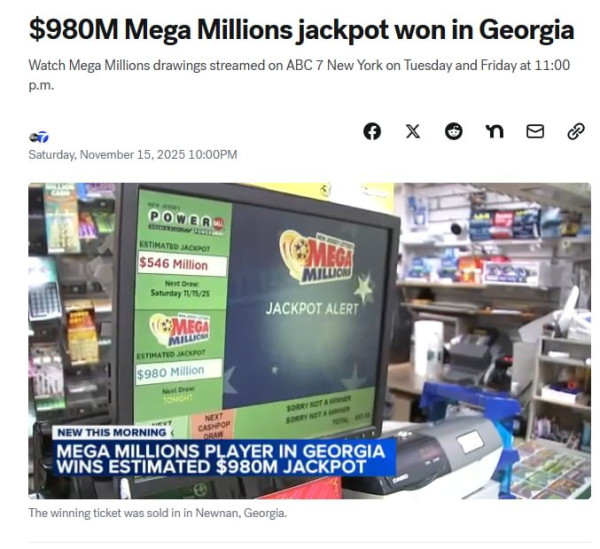 미국 조지아주에서 1조 4200억 복권 당첨자 탄생