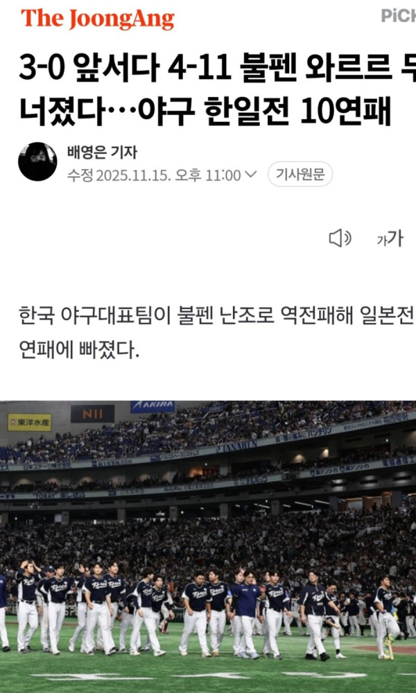일본전 승리가 어느덧.,10년전.... 작성자 정보 짭스쪽지보내기 자기소개 아이디로 검색 전체게시물쪽지보내기 자기소개 아이디로 검색 전체게시물 작성 작성일 2025.11.16 06:53 컨텐츠 정보 12 조회 1 댓글 목록 본문 일본 국대 마지막 이긴게 2015년 프리미어 오타니 내려가고 기적의 승리 그 경기가 마지막이라네요ㅜ SNS 공유 신고 짭스쪽지보내기 자기소개 아이디로 검색 전체게시물쪽지보내기 자기소개 아이디로 검색 전체게시물 레벨 96 100% 등록일 07:56 오늘 선발은 루키대결이라네요 등록일 06:53 일본전 승리가 어느덧.,10년전.... 댓글 1 등록일 11.15 백투백 송성문 댓글 3 등록일 11.15 안현민 선제투런 빠던 댓글 4 관련자료 댓글 1 발야구님의 댓글 발야구쪽지보내기 자기소개 아이디로 검색 전체게시물쪽지보내기 자기소개 아이디로 검색 전체게시물 작성일 07:25 야구, 축구 모두 기가 꺾기나요?? 신고 야구, 축구 모두 기가 꺾기나요?? 로그인한 회원만 댓글 등록이 가능합니다. 목록