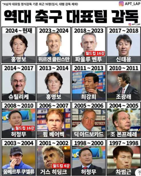 벤투감독, 히딩크감독감독 그립습니다. 검독의 선임은 협회의 권한 입니다. 장기적인 계획없이 그 때 그때 성적만을 위한은 선임으로 다들 단명하였습니다. 그로인하여 축구발전의 기회를 늘 놓쳐왔습니다. 이것이 아쉬운 대목입니다. 축협의 무능과 무지로 20년 잃어버린 세월이 되었습니다. 정씨회장시대가 축구발전에 기여도 많이 했지만 지금도 정씨가 회장하는것이 맞나? 의문이 듭니다.이 시대에 감독 명보가 맞는지 다시 한번 고려해야합니다. 한국축구발전측면에서?