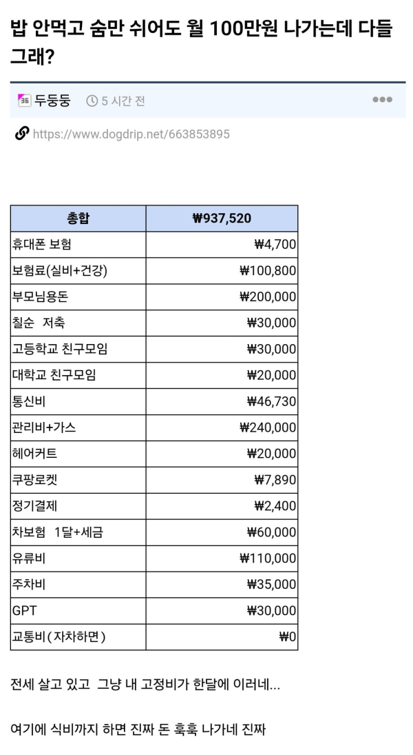 밥 안먹고 숨만 쉬어도 월 100만원 나가는데 다들 그래?