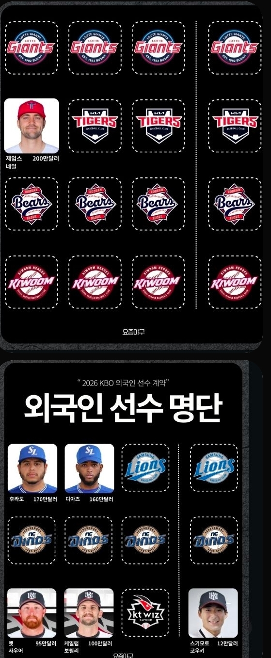 KBO 외국인 선수 명단 작성자 정보 짭스쪽지보내기 자기소개 아이디로 검색 전체게시물쪽지보내기 자기소개 아이디로 검색 전체게시물 작성 작성일 2025.11.27 20:58 컨텐츠 정보 11 조회 목록 본문 아직 한명도 안채운 구단은..? SNS 공유 신고 짭스쪽지보내기 자기소개 아이디로 검색 전체게시물쪽지보내기 자기소개 아이디로 검색 전체게시물 레벨 96 100% 등록일 20:58 KBO 외국인 선수 명단 등록일 20:19 복싱이 힘든이유.. 등록일 18:46 층간소음 매달200줄게요..ㅡㅡ 댓글 2 등록일 18:38 귤을 이렇께 까면? 댓글 2 관련자료 댓글 0 등록된 댓글이 없습니다. 로그인한 회원만 댓글 등록이 가능합니다. 목록