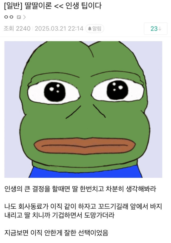 인생의 꿀팁. 자위론. 작성자 정보 아몰랑쪽지보내기 메일보내기 자기소개 아이디로 검색 전체게시물쪽지보내기 메일보내기 자기소개 아이디로 검색 전체게시물 작성 작성일 2025.11.28 15:18 컨텐츠 정보 4 조회 1 댓글 목록 본문 게시판 활동이 적극적이고 지속적이면 레벨업 됩니다. SNS 공유 신고 아몰랑쪽지보내기 메일보내기 자기소개 아이디로 검색 전체게시물쪽지보내기 메일보내기 자기소개 아이디로 검색 전체게시물 레벨 49 97% 등록일 15:36 맡아봐 제철 생선이야 댓글 1 등록일 15:28 바빠서 진도가 잘 나가지 않았던 1000피스 퍼즐을 이제 곧 완성하려던 참이였으나.. 댓글 1 등록일 15:25 의리가 넘치는 개 댓글 1 등록일 15:19 용한 무당 댓글 1 관련자료 댓글 1 아몰랑님의 댓글 아몰랑쪽지보내기 메일보내기 자기소개 아이디로 검색 전체게시물쪽지보내기 메일보내기 자기소개 아이디로 검색 전체게시물 작성일 15:21 저 상황에 안 도망치면 그게 이상할듯... 신고 저 상황에 안 도망치면 그게 이상할듯...{emo:onion-010.gif:50} 로그인한 회원만 댓글 등록이 가능합니다. 목록