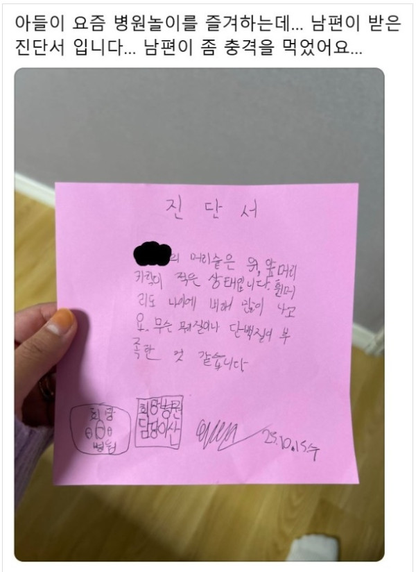 충격 받은 진단서 작성자 정보 데굴데굴쪽지보내기 메일보내기 자기소개 아이디로 검색 전체게시물쪽지보내기 메일보내기 자기소개 아이디로 검색 전체게시물 작성 작성일 2025.12.07 23:04 컨텐츠 정보 28 조회 2 댓글 목록 본문 게시판 활동이 적극적이고 지속적이면 레벨업 됩니다. [펌] SNS 공유 신고 데굴데굴쪽지보내기 메일보내기 자기소개 아이디로 검색 전체게시물쪽지보내기 메일보내기 자기소개 아이디로 검색 전체게시물 레벨 65 99% 등록일 12.07 충격 받은 진단서 댓글 2 등록일 12.07 의사도 보고 터진 드립 댓글 2 등록일 12.07 처음 혼자 일하는 알바생과 배짱 장사하는 사장님 댓글 2 등록일 12.07 출석 관련자료 댓글 2 데굴데굴님의 댓글 데굴데굴쪽지보내기 메일보내기 자기소개 아이디로 검색 전체게시물쪽지보내기 메일보내기 자기소개 아이디로 검색 전체게시물 작성일 12.07 23:07 탈모와 흰머리는 가족을 먹여 살리기위하다보니 그렇게 된 것 일텐데 아들이 아픈곳을 건드는구나^^;;;; 신고 탈모와 흰머리는 가족을 먹여 살리기위하다보니 그렇게 된 것 일텐데 아들이 아픈곳을 건드는구나^^;;;; 발야구님의 댓글 발야구쪽지보내기 자기소개 아이디로 검색 전체게시물쪽지보내기 자기소개 아이디로 검색 전체게시물 작성일 05:15 훌륭한 의사 자질이 보이는 아들~~ 신고 훌륭한 의사 자질이 보이는 아들~~ 로그인한 회원만 댓글 등록이 가능합니다. 목록