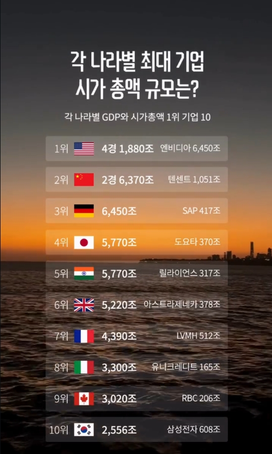 • 국가의 GDP는 경제력이지만, 기업의 시총은 미래에 대한 믿음입니다.
