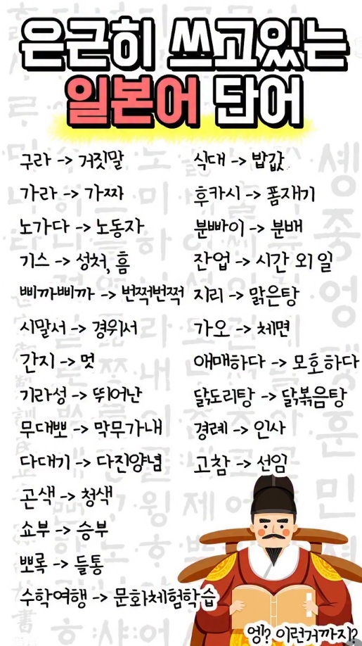 근데 알고 보면 우리 일상 속에도 일본어가 이렇게 많았다고?! 작성자 정보 승승장구쪽지보내기 자기소개 아이디로 검색 전체게시물쪽지보내기 자기소개 아이디로 검색 전체게시물 작성 작성일 2025.12.09 18:34 컨텐츠 정보 19 조회 1 댓글 목록 본문 게시판 활동이 적극적이고 지속적이면 레벨업 됩니다. SNS 공유 신고 승승장구쪽지보내기 자기소개 아이디로 검색 전체게시물쪽지보내기 자기소개 아이디로 검색 전체게시물 레벨 58 98% 등록일 21:08 골든글러브 2회 이상 수상 현역 선수 등록일 21:02 연령대 별로 꼭 챙겨야 하는 필수 영양제 TOP 5 등록일 21:01 조기 발견이 생명을 살립니다 암의 전조증상들 등록일 21:00 2025 중앙일보 발표 대학평가 종합순위 TOP 20 댓글 1 관련자료 댓글 1 발야구님의 댓글 발야구쪽지보내기 자기소개 아이디로 검색 전체게시물쪽지보내기 자기소개 아이디로 검색 전체게시물 작성일 19:41 정말 많으네요~~~ 신고 정말 많으네요~~~ 로그인한 회원만 댓글 등록이 가능합니다. 목록