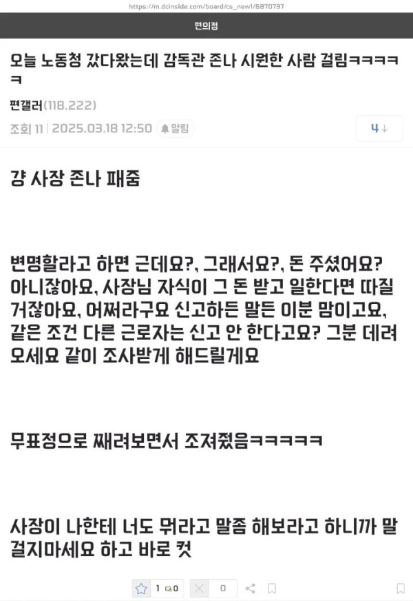 일에 찌든 노동청 감독관 작성자 정보 데굴데굴쪽지보내기 자기소개 아이디로 검색 전체게시물쪽지보내기 자기소개 아이디로 검색 전체게시물 작성 작성일 2025.12.10 23:44 컨텐츠 정보 6 조회 1 댓글 목록 본문 게시판 활동이 적극적이고 지속적이면 레벨업 됩니다. [펌] SNS 공유 신고 데굴데굴쪽지보내기 자기소개 아이디로 검색 전체게시물쪽지보내기 자기소개 아이디로 검색 전체게시물 레벨 72 99% 등록일 12.10 미용실에 별로 대화하고 싶지 않다라는 앙케이트가 있었다 댓글 1 등록일 12.10 일에 찌든 노동청 감독관 댓글 1 등록일 12.10 나이들수록 공감되는 문장 댓글 1 등록일 12.10 쇼핑백 디자인 1티어? 댓글 1 관련자료 댓글 1 데굴데굴님의 댓글 데굴데굴쪽지보내기 자기소개 아이디로 검색 전체게시물쪽지보내기 자기소개 아이디로 검색 전체게시물 작성일 12.10 23:45 감독관이 성질이 좀 있네^^;; 신고 감독관이 성질이 좀 있네^^;; 로그인한 회원만 댓글 등록이 가능합니다. 목록